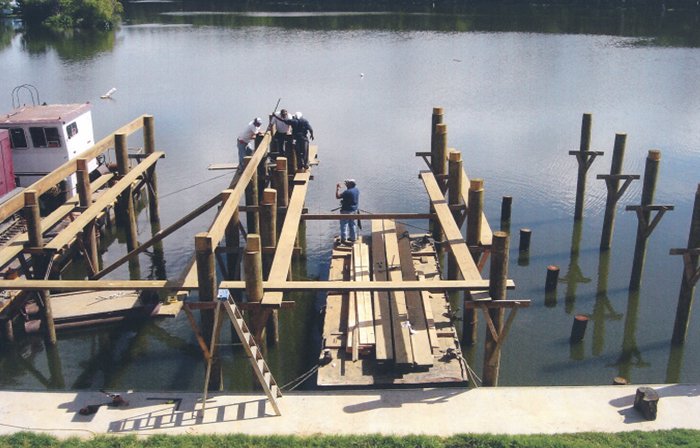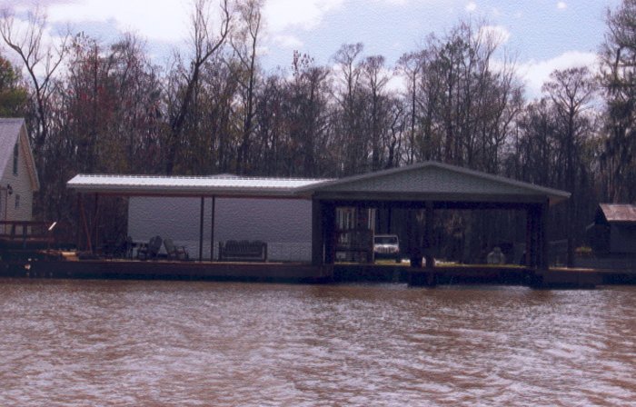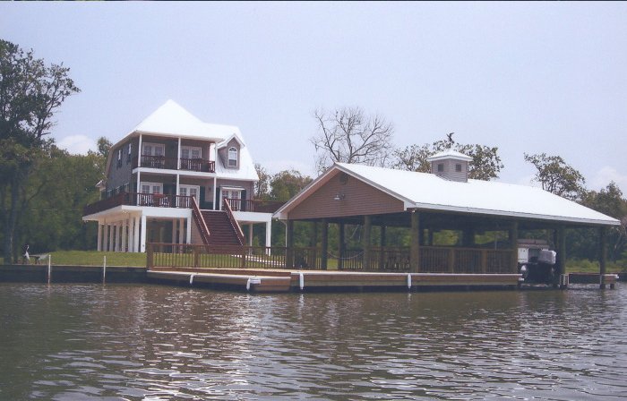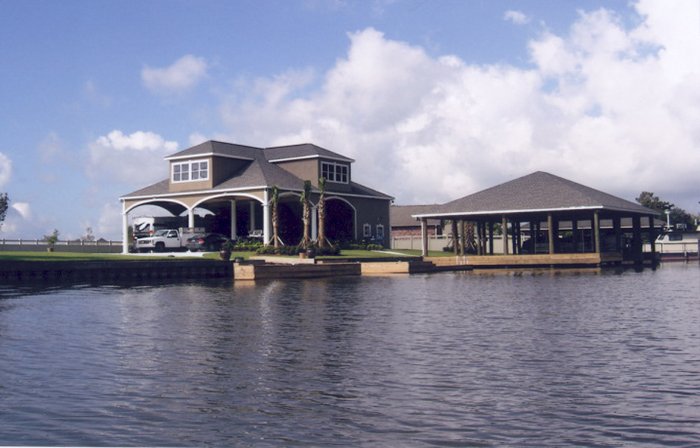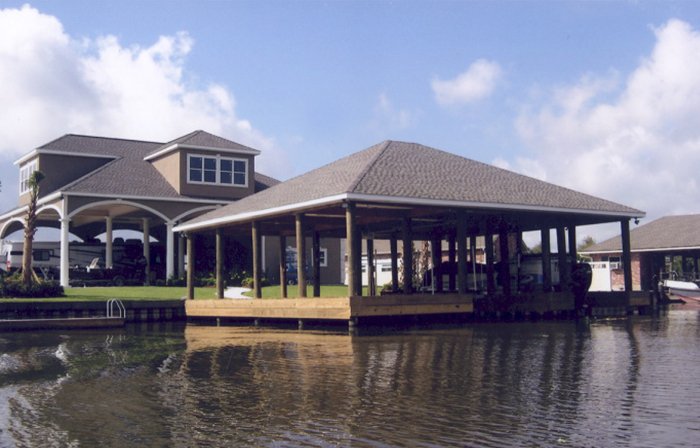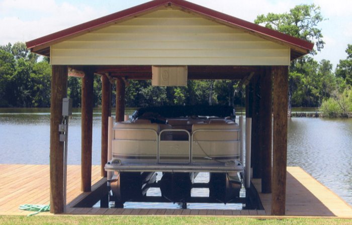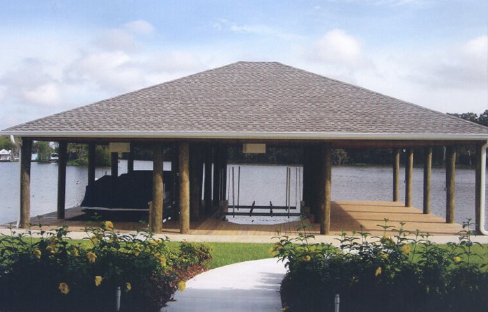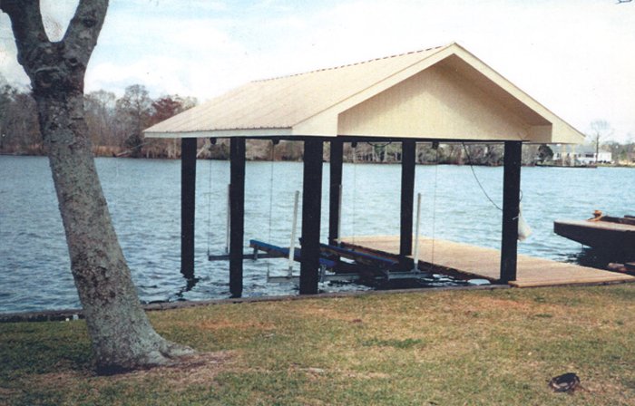 Top left picture taken during construction. Installation was for a double boat stall for a party barge and bass boat. We installed vinyl siding, metal roof and weathervane on top (cupola). Also installed was hand rails, side decks, boat lift and a boat bumper system. This particular design was to match the existing home.