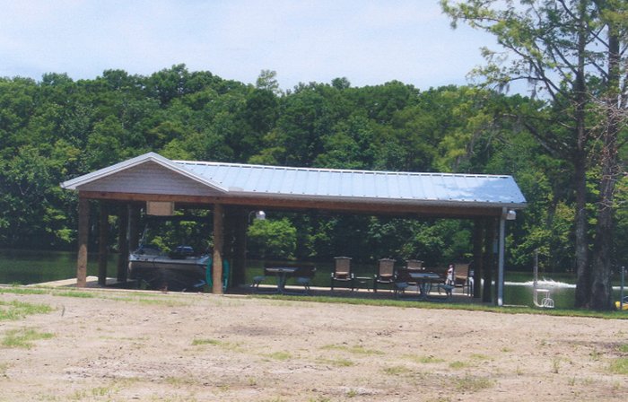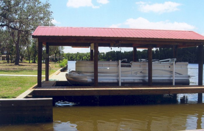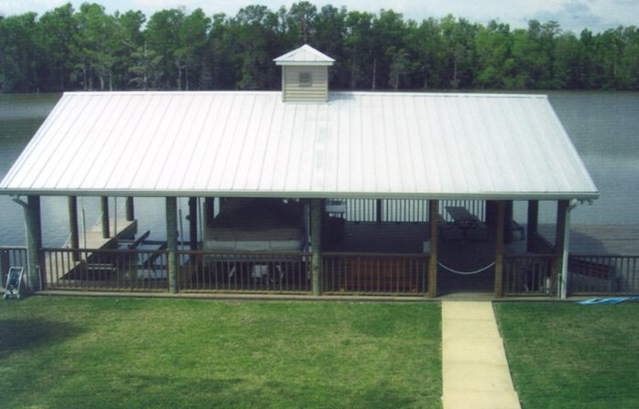 Top left picture taken during construction. Installation was for a double boat stall for a party barge and bass boat. We installed vinyl siding, metal roof and weathervane on top (cupola). Also installed was hand rails, side decks, boat lift and a boat bumper system. This particular design was to match the existing home.